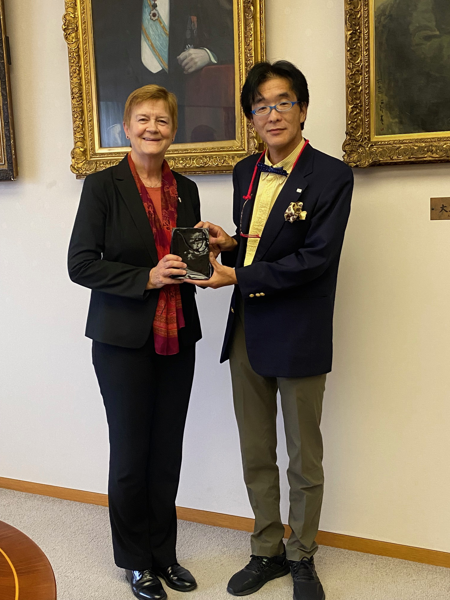 ノルウェー大使館来訪 2024年10月8日(火)駐日ノルウェー大使館より Kristin Iglum大使他、エネルギー・技術参事官、水産課参事官、アドバイザーの4名が洋上風力研究教育センターとの意見交換のため九州大学を来訪されました。 洋上風力研究教育センターの取組みや研究戦略についての説明後、ノルウェーにおけるグリーンエネルギーへの取り組み、ノルウェーの大学や企業との連携の可能性等について、当センターの研究者との間で活発な意見交換が交わされました。 Kristin Iglum大使(左)と谷本潤センター長(右)