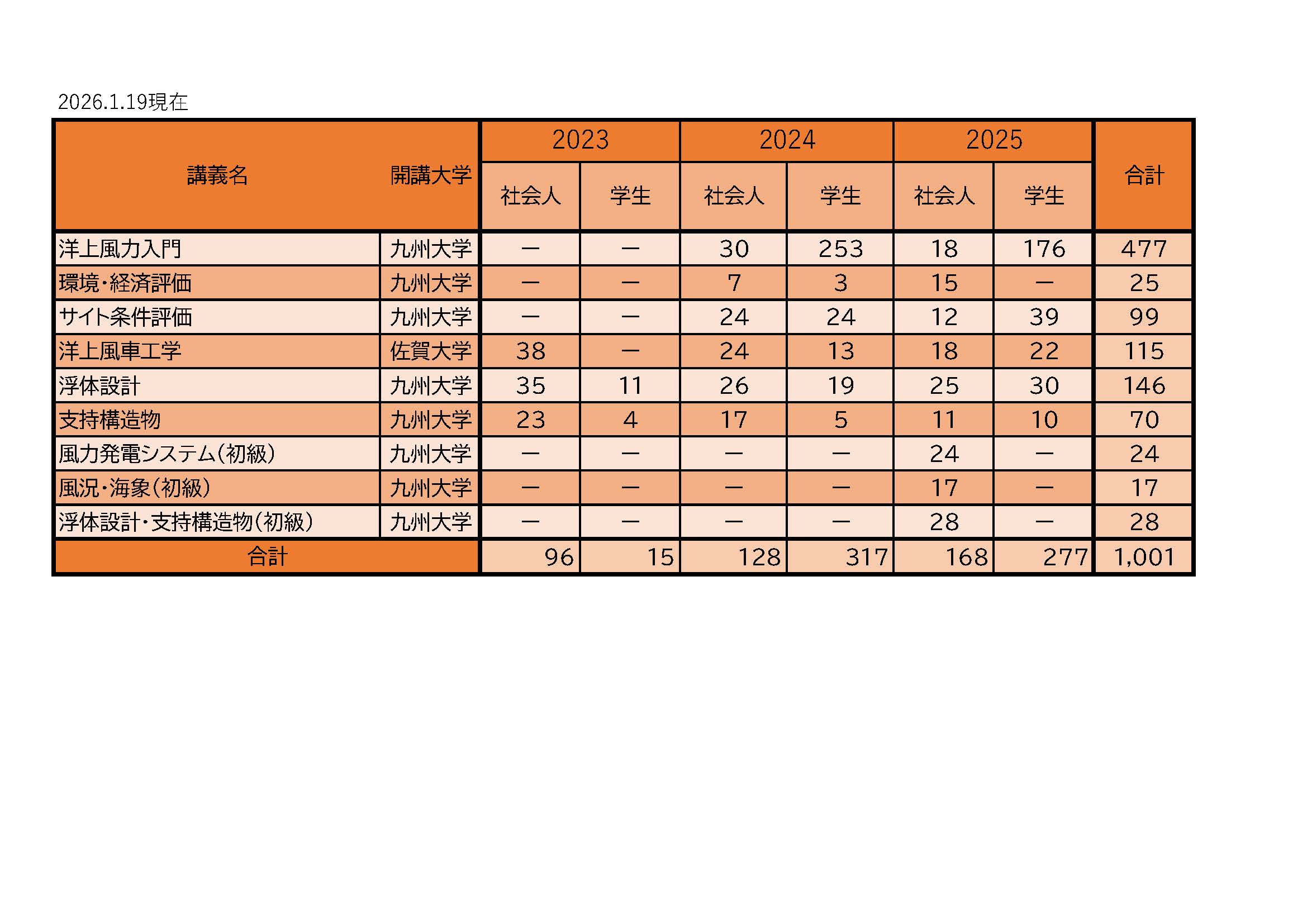 洋上風力発電人材育成講座の受講者数(2026年3月実施の浮体設計・支持構造物【初級】の申込者を含む)